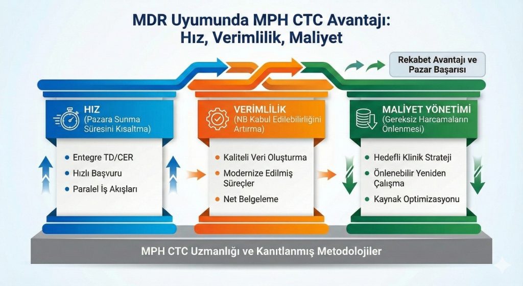 MDR uyum süreci karmaşık, zaman alıcı ve maliyetlidir. MPH-KAM olarak, bu zorlu süreçte üreticilere rekabet avantajı sağlayan üç temel sütun üzerine odaklanıyoruz: Hız, Etkinlik ve Maliyet Yönetimi.