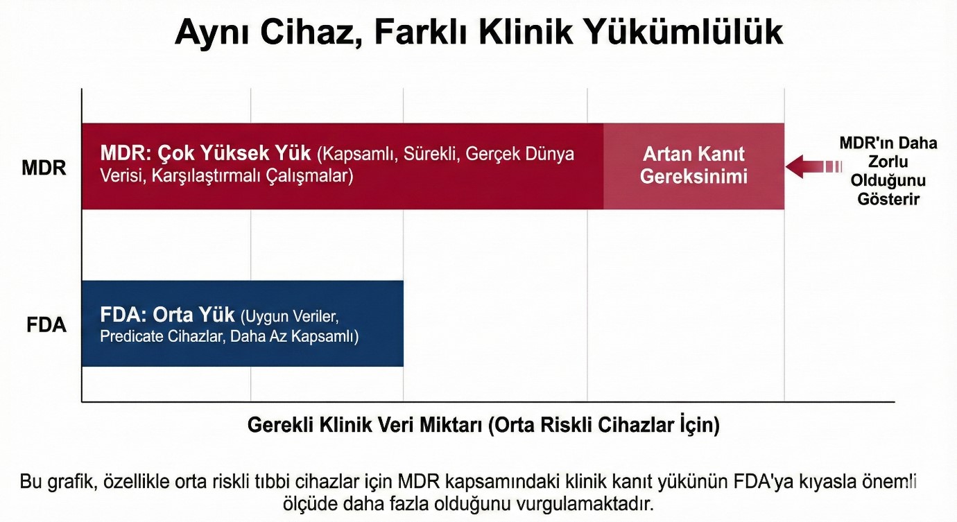 Bu iki sistem arasındaki en büyük çatışma, özellikle orta-yüksek riskli cihazlarda (MDR IIa/IIb) ortaya çıkan klinik kanıt yükümlülüğüdür.